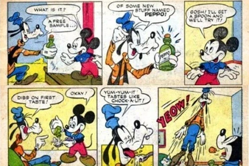 În 1951, un mini-comic „Mickey Mouse and the Medicine Man” îl avea pe Mickey pozând într-un fel de traficant de droguri. Comicul a fost creat în asociere cu General Mills Wheaties. După cum spune povestea, prieteni grozavi, Mickey și Goofy dau împreună peste un medicament nou rar numit „Peppo”, care, atunci când este consumat, amfetaminează consumatorul și îl face să se comporte ca un ticălos. Așa că Mickey continuă să preia drepturile de distribuție ale lui Peppo în regiunea Africii, care este evident urmată de obișnuita aventură africană. La final, Mickey îl droghează pe vraciul rău cu Peppo și salvează situația. Totul e bine care se termină cu bine, spun ei.